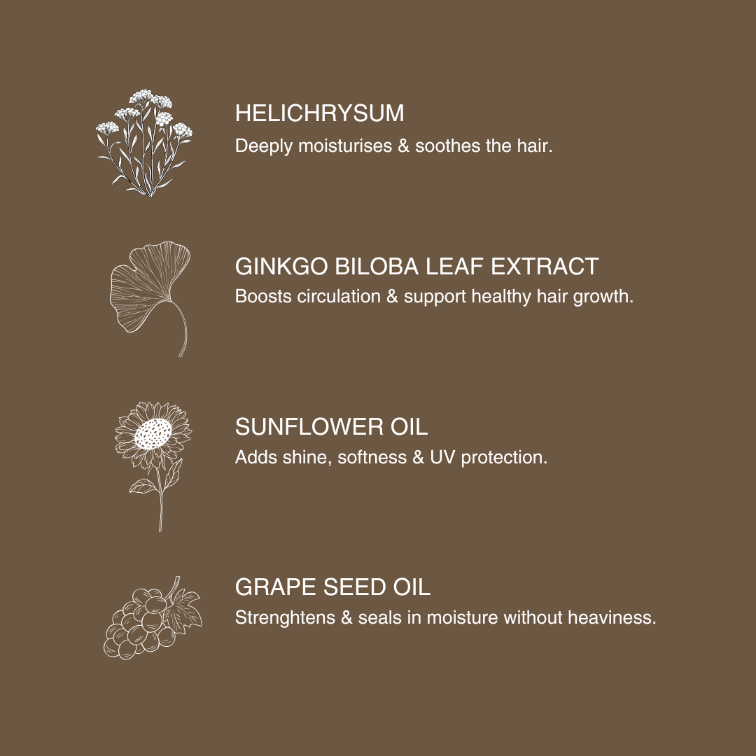 A powerful blend of Helichrysum extract, Ginkgo Biloba, sunflower oil & Grape Seed oil rich in Vitamin A & E. These ingredeints work together to lock in moisture, boost elasticity, add shine, protect from UV damage & support colour longevity while reducing breakage.